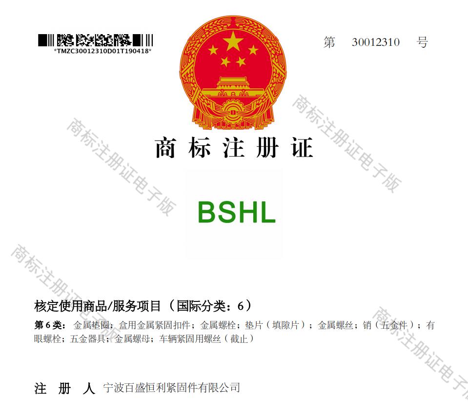 恭贺宁波百盛恒利紧固件有限公司取得商标证书