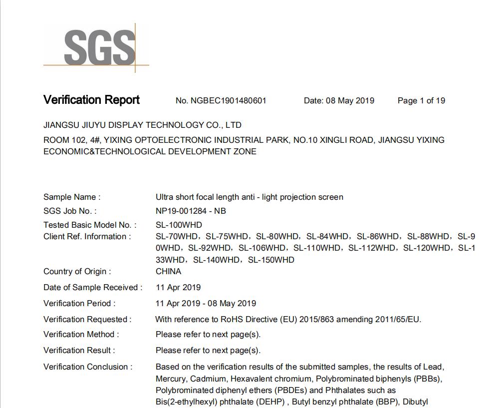 恭贺江苏久誉显示科技有限公司取得SGS检测报告