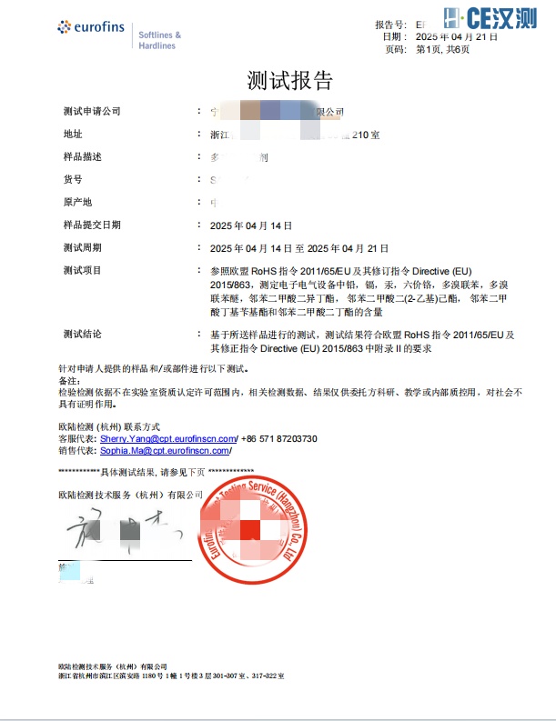 恭贺宁波莱昂德尔化工科技有限公司获得欧盟ROHS检测报告